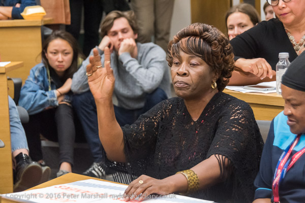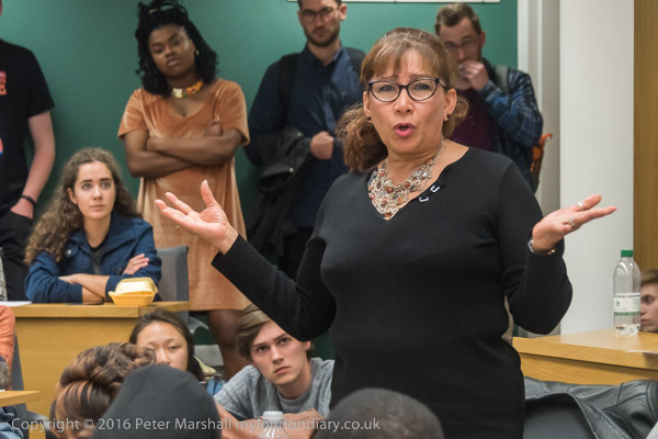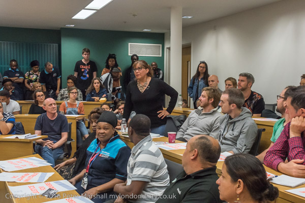 Sandy Nicoll from SOAS Unison tells the meeting about their 10 year fight to bring the cleaners in-house