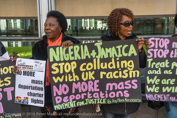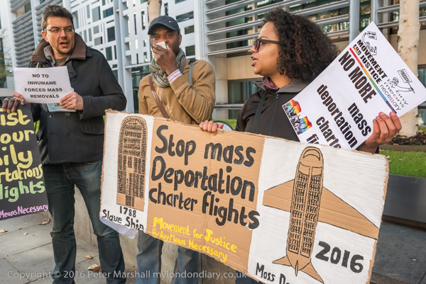'Stop Mass Deportation Charter Flights' and an airplane