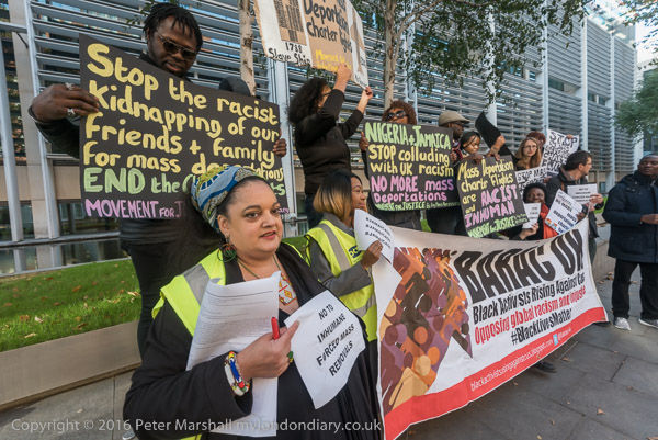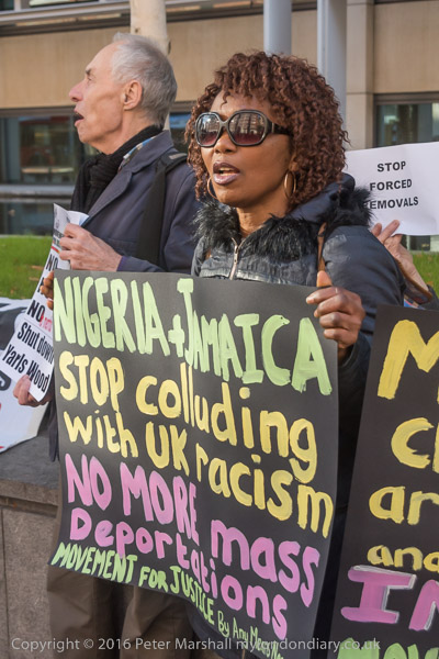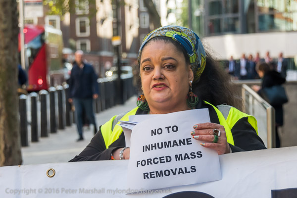 Zita Holbourne holds posters 'No to Inhumane forced mass removals'