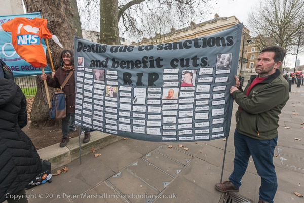 Campaigners hold a banner 'Deaths due to sanctions and benefit cuts