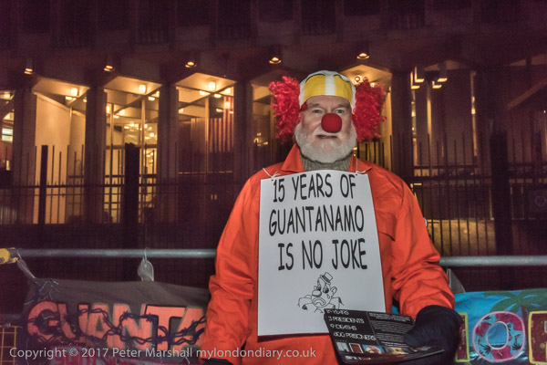 and a clown in orange jumpsuit with the message '15 years of Guantanamo