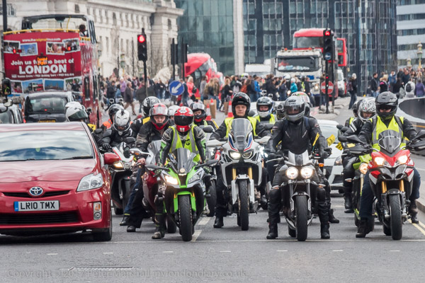 Hundreds of bike riders set out on two rides from the Ace Café in Stonebridge and Greenwich into central London to raise awareness about the growing problem of motorbike theft and I photographed them in and around Parliament Square.