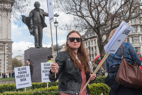 A grass roots group of young people, '#1821Resist', came to Parliament Square to protest against the scrapping of housing benefit for young people which comes into force today.