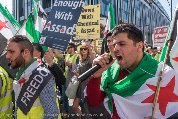 Protesters met at Marble Arch to march along Oxford St on their way to a rally at Downing St against Assad's use of chemical weapons in Syria.
