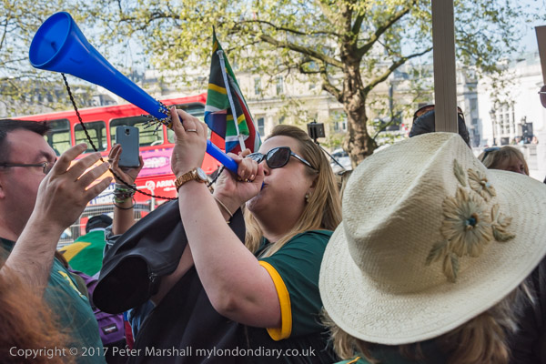 South Africans protested outside the South African High Commission in London in defence of South Africa's democracy and called for the removal of President Zuma.
