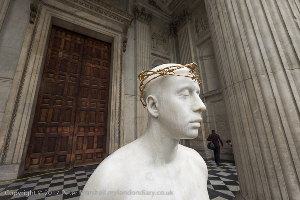 The sculpture had looked small and insignificant when it was the first to be displayed on the fourth plinth in Trafalgar Square seemed far better suited to its location on the steps, where people could approach it closely. Roughly life-size (who knows how tall Jesus was, many tourists took the opportunity to be photographed standing alongside it, though I rather thought they detracted from its impact, and photographed the statue without them.