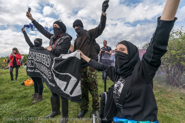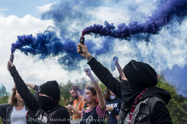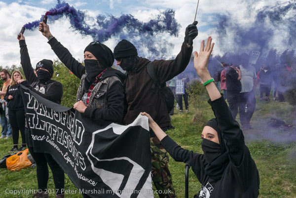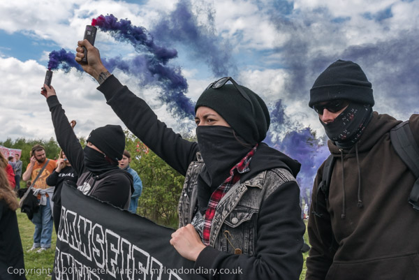 And anti-fascists hold smoke flares and wave