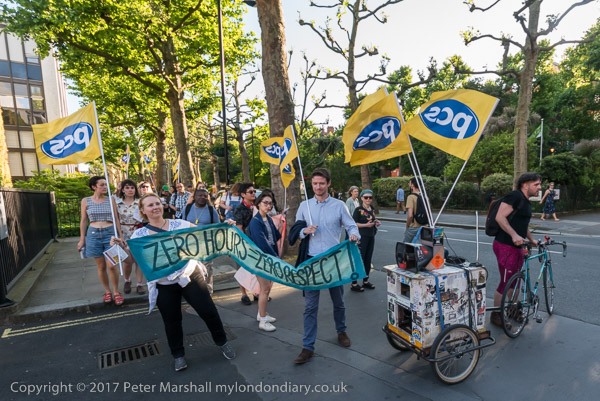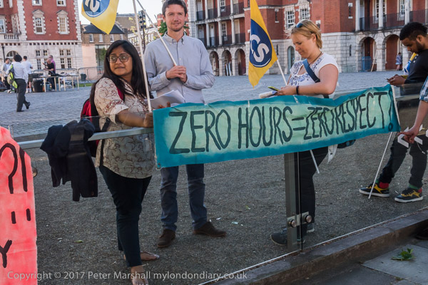 They march to the staff entrance behind the banner 'Love Tate Hate
