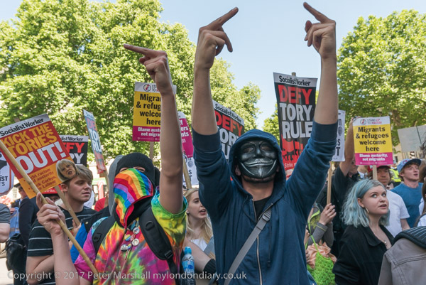 After the rally celebrating the Corbyn's leadership and performance in the General Election, most of those present walk to Downing St to celebrate anti-racism and multiculturalism and against all bigotry.