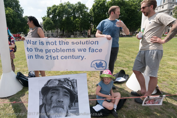 Avaaz had brought a person with a large caricature head Of Theresa May to Downing St to pose in front of a banner 'The People Have Spoken' and lay white roses in front of a gravestone with the message 'Hard Brexit R.I.P 2016-2017'. There were a few other protesters there too. And at College Green a couple of Class War activists, Ian Bone and Sid Skill had come to barrack from the sidelines the MPs and journalists carrying out interviews in the media village there. Apart from them and a few other individuals, Westminster seemed strangely empty.