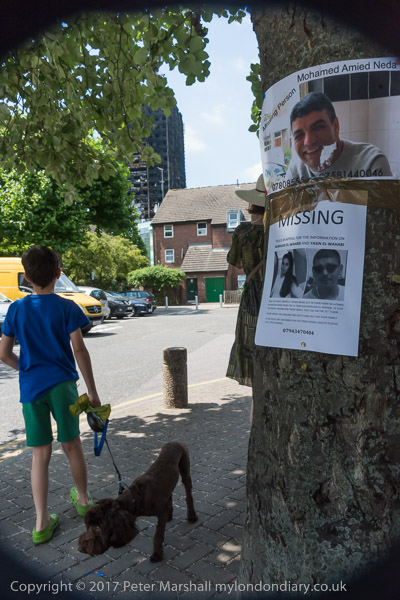 Grenfell Tower from the church. Police barriers prevent a closer approach
