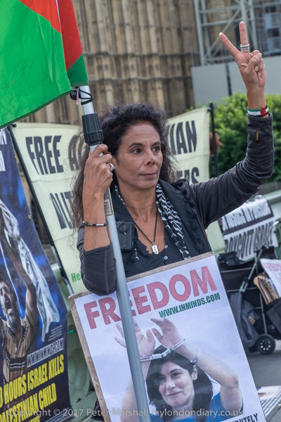 One flag has the message 'Free Palestine' and the other 'Boycott Israel'