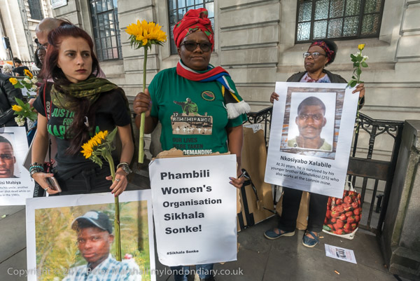 Protesters hold a protest vigil outside the South African High Commission in Trafalgar Square on the 5th anniversary of the massacre when 34 striking miners were shot dead by South African police at Lonmin's Marikana platinum mine.