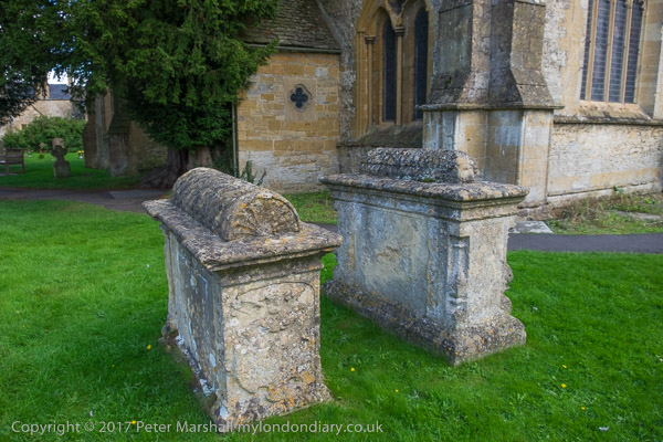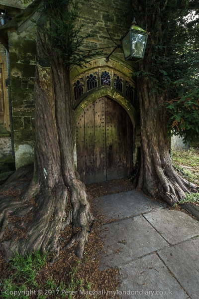 Bakcs of houses along an alley next to Stow-on-the-Wold churchyard