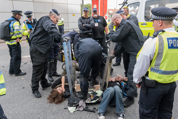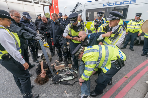 One of the Buddhists arrives and is moved onto the pavement by a police