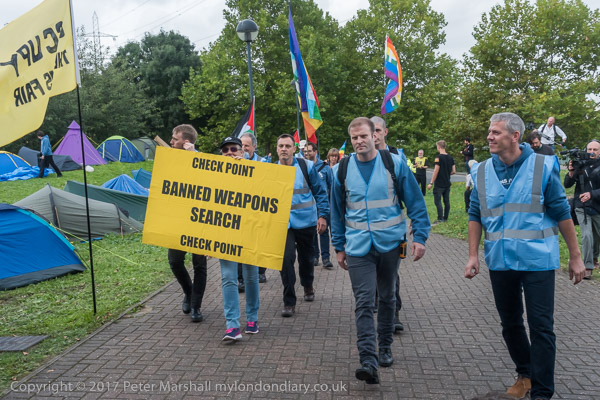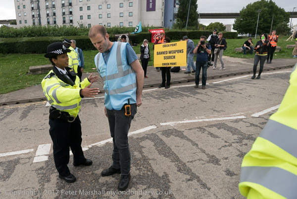 Veterans For Peace pose with their 'Check Point - Banned Weapons Search'