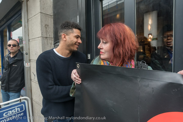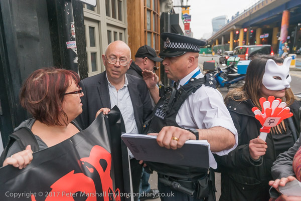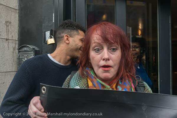 A man pushes his way into the shop past one of the protesters