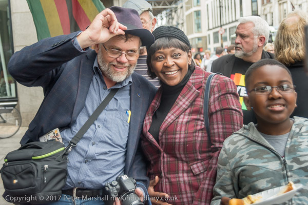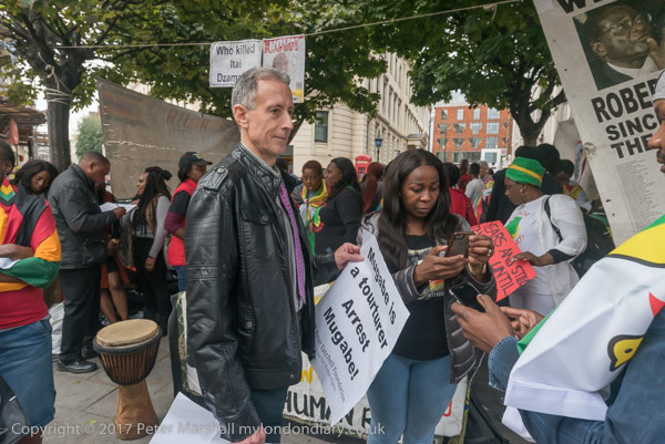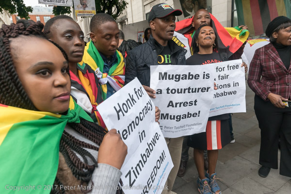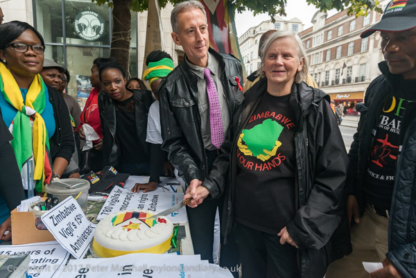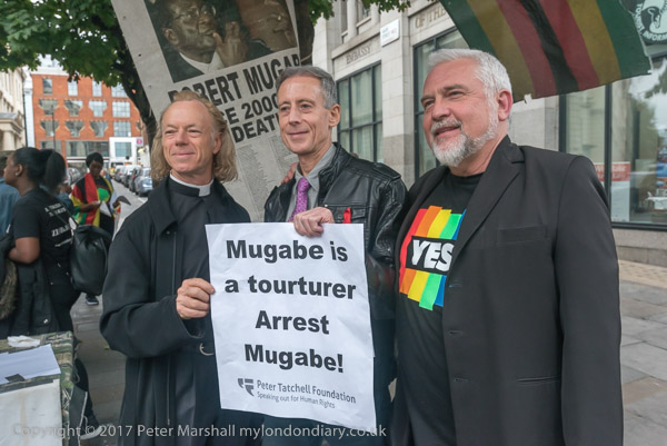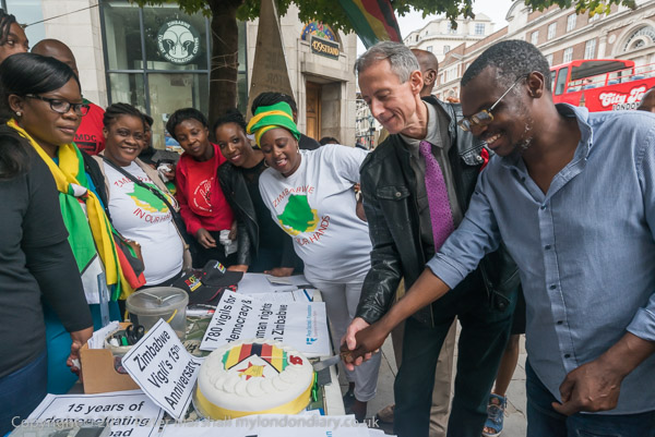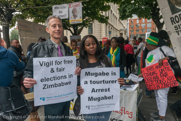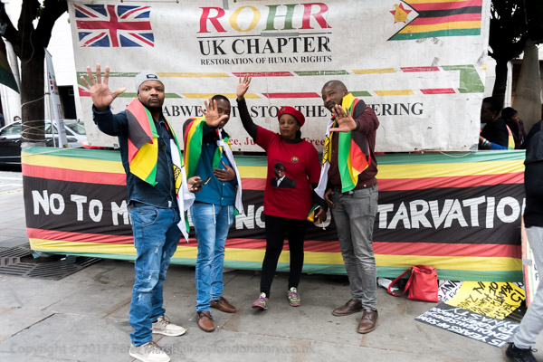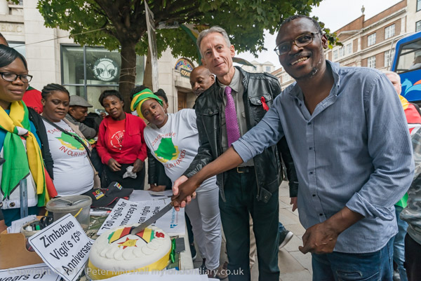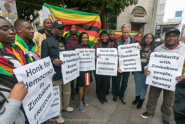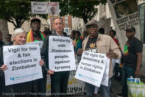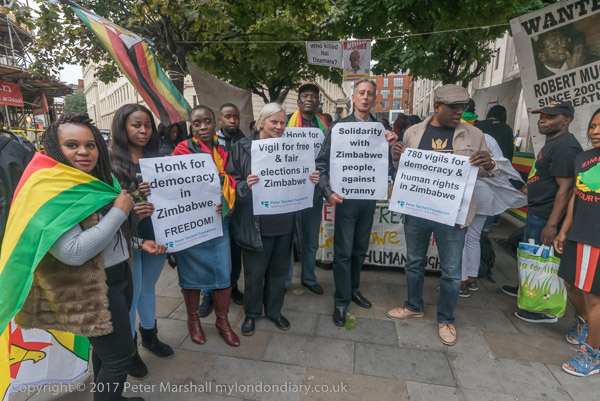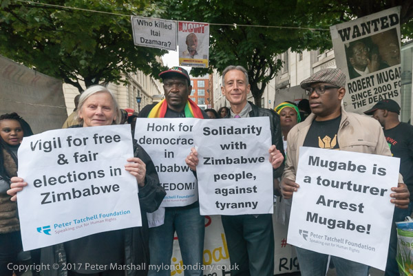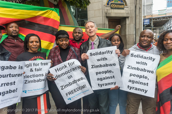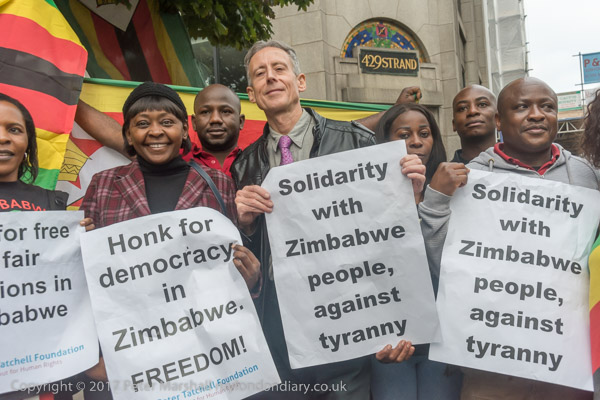 People pose with Peter Tatchell holding posters 'Solidarity with Zimbabwe