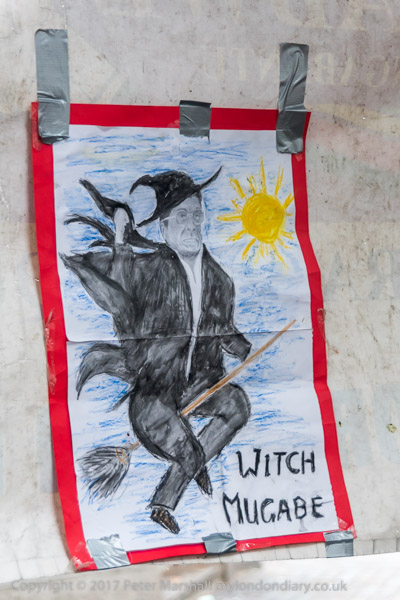 and he came with posters. One reads 'Mugabe is a torturer Arrest Mugabe!'