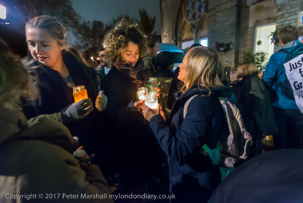 People hold candles in jars
