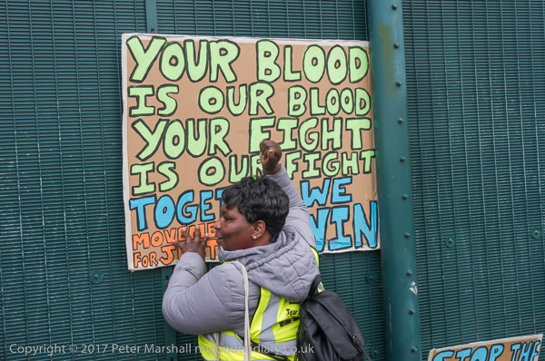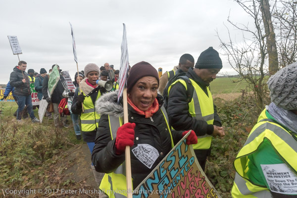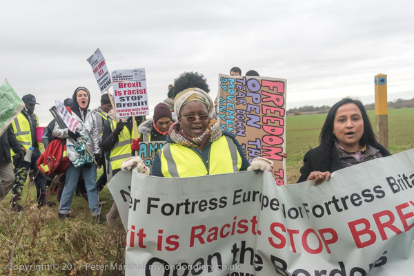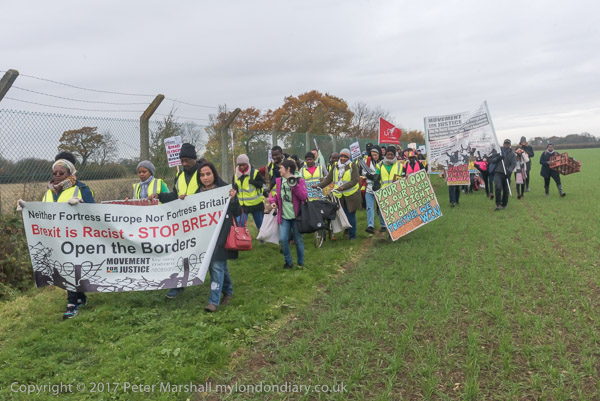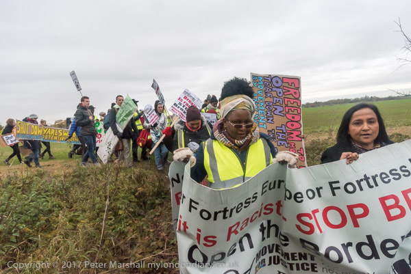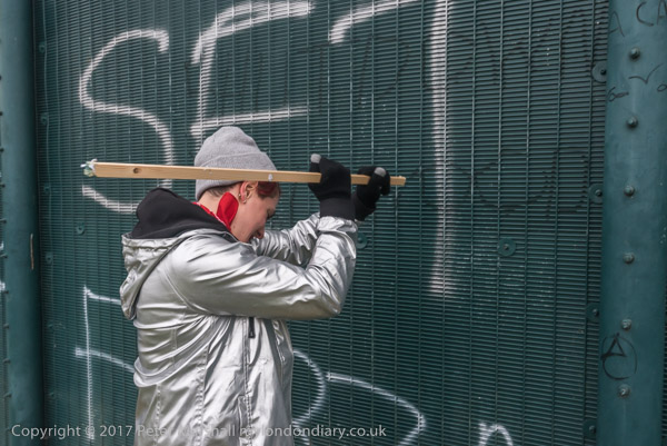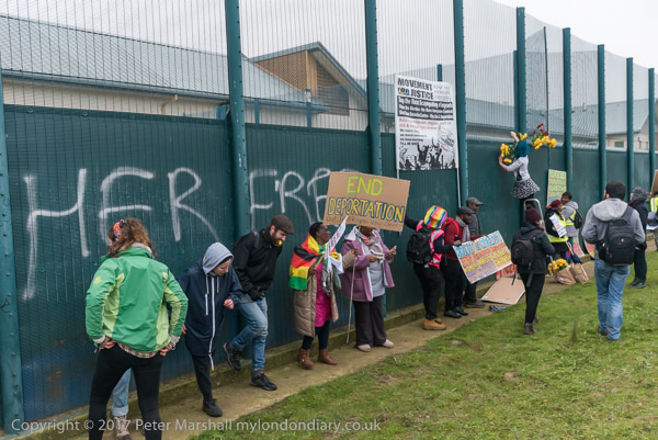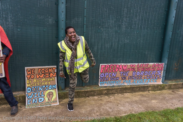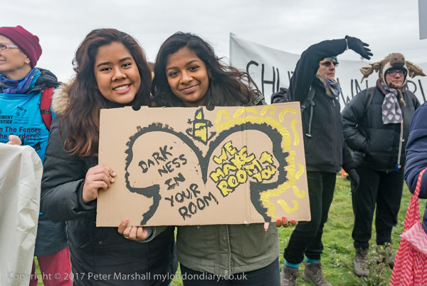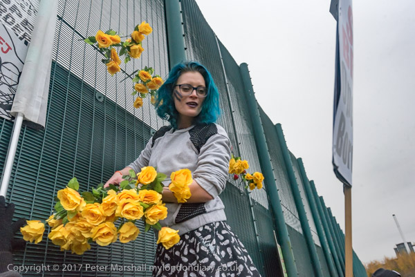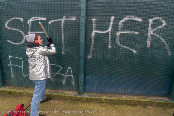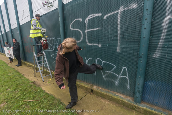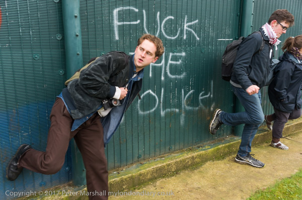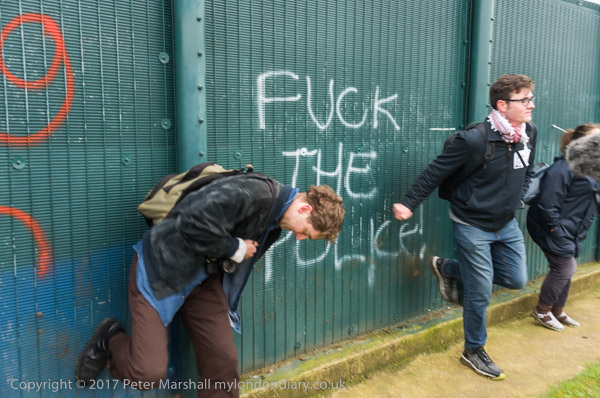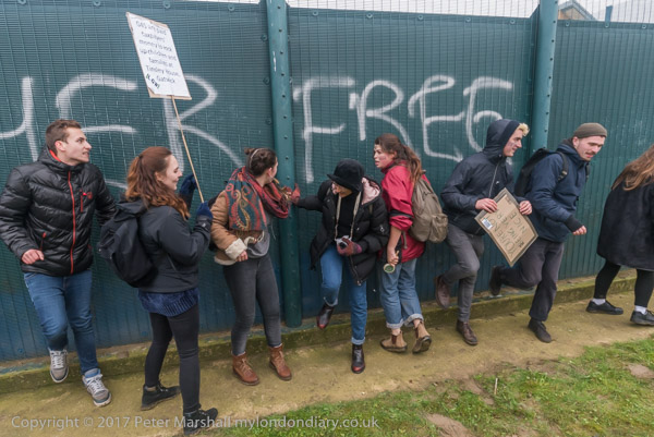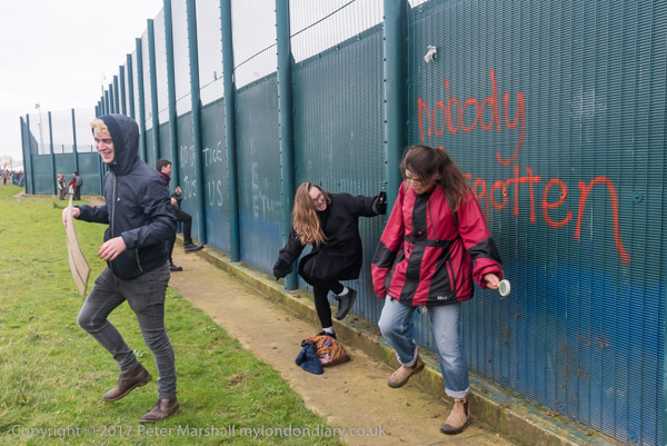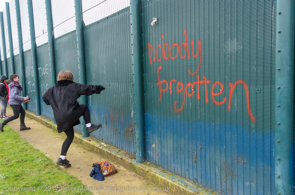 and are soon at the fence with graffiti from a previous protest 'nobody