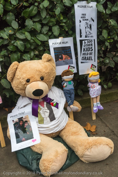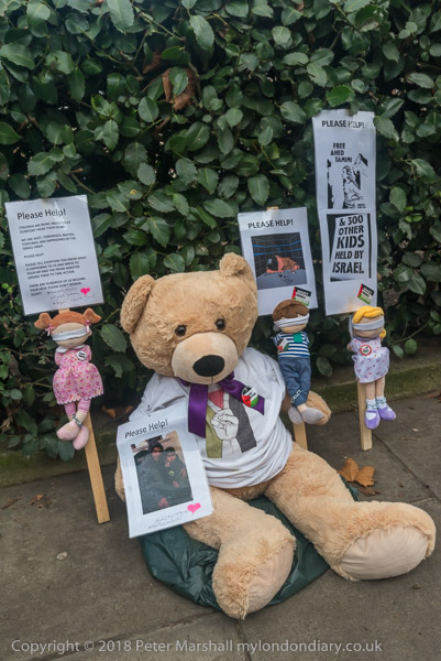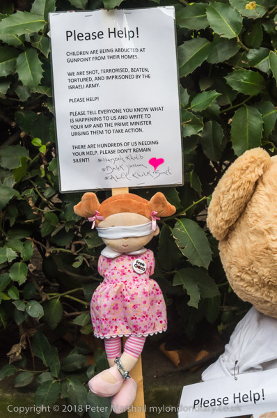 Dolls and a bear for the protest - with a photograph of one of the