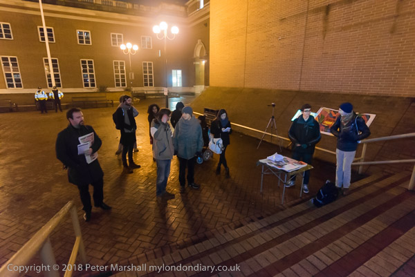 Andrew Cooper stands with his banner and posters. He holds a pair