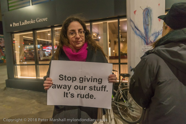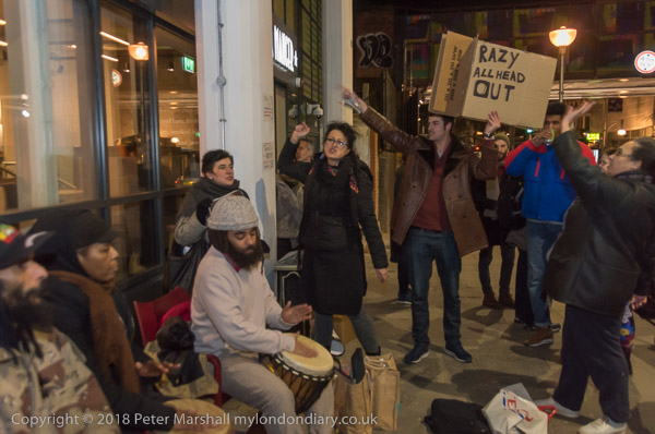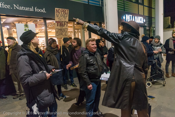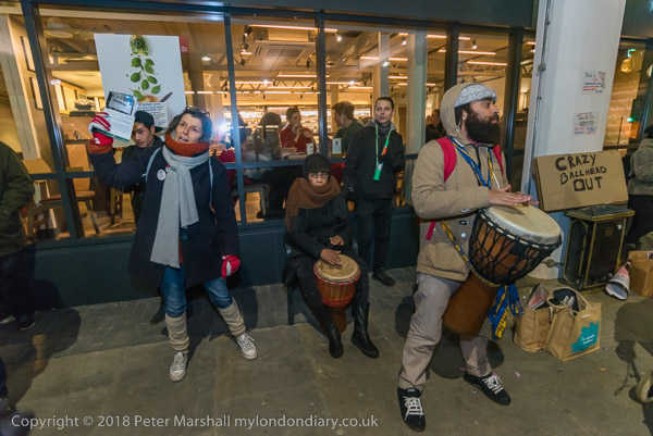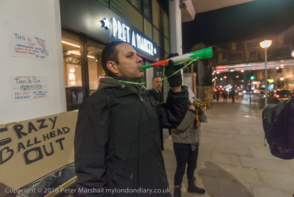 People dance and shout 'Shame on You!' pointing to Pret-a-Manger