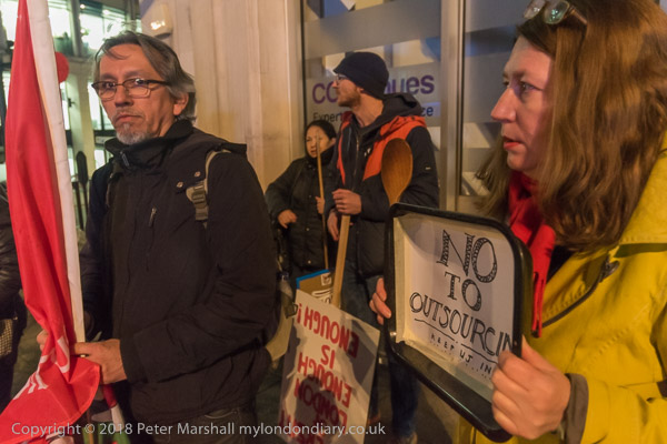 Outsourced workers, including cleaners, security officers, receptionists, porters and gardeners who keep the university running smoothly protested noisily outside University of London Vice Chancellor Sir Adrian Smith's graduation dinner, calling on the university to employ them directly, for an end to zero hours contracts and to implement promised pay rises.