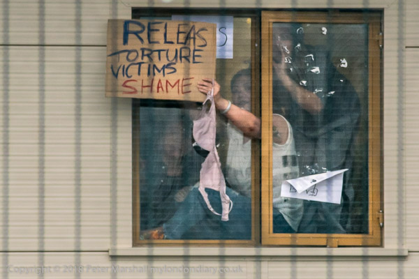 MfJ have a record since around 2014 of organising many protests at detention centres including this and elsewhere, and and of working with detainees inside them and after their release, preventing deportations etc, and clearly have earned and retain the support of many former detainees. They have put countless hours into leading the fight to get detention centres closed, and to stop deportations as well as considerable expense. It has been a fight that has been a consequence of their clearly stated political position, consistent with their other actions since I first met them in the late 1990s in Brixton and Tottenham.