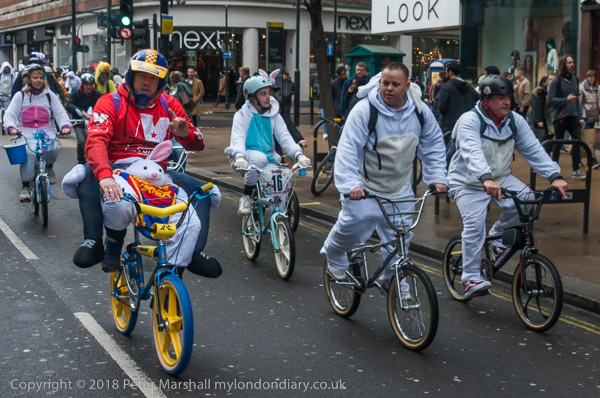 A large group of BMX bike riders dressed as Easter Bunnies taking part in the 4th Bunny Hop ride-out in London by BMXLife to the streets to raise money for children staying at Evelina London Children’s Hospital passed me as I was walking along Oxford St and I took a few pictures.