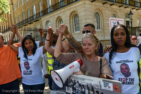 Community groups and campaigners against knife and gun crime protest opposite Downing St, calling on Theresa May to take action to stop the growing number of killings using knives across the country.