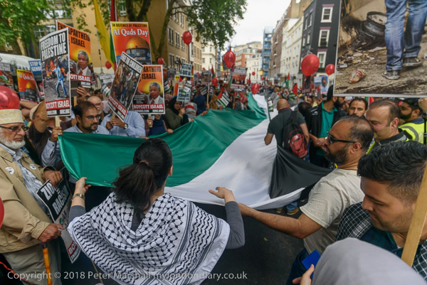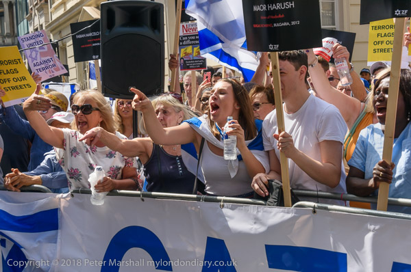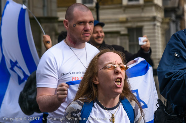 One wore a shirt with the message "There's no such thing as Palestine", more an Israeli government intention than any connection with the continuous existence of Palestine since at least the days of Abraham. Another held the flag of the Israeli Defence forces, whose snipers have shot hundreds if not thousands of unarmed demonstrators in the past few weeks.