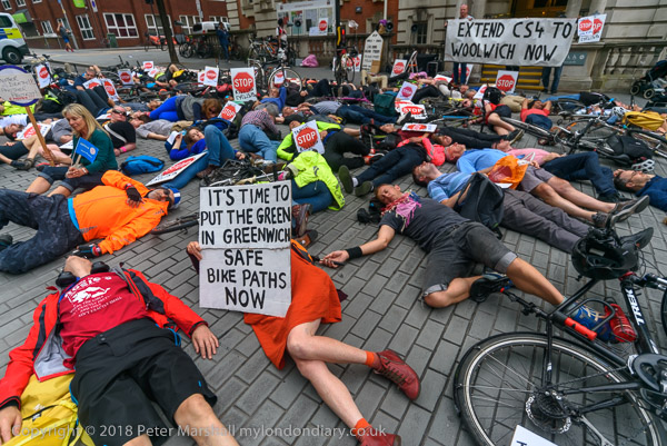 Cyclists staged a die-in outside Greenwich Council offices in Woolwich after three cyclist were killed by vehicles in the area in recent weeks, two by HGV trucks on the notoriously unsafe Woolwich Rd.