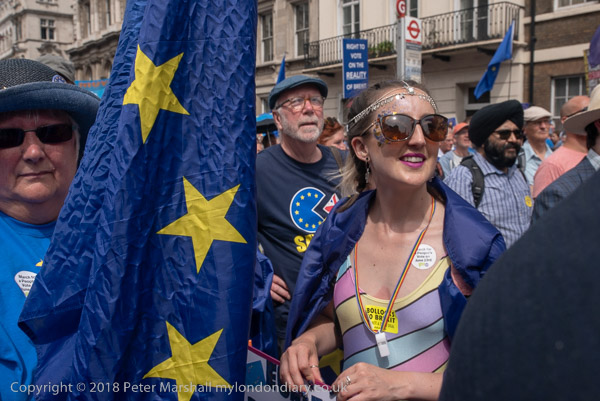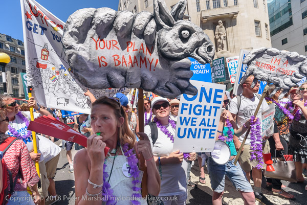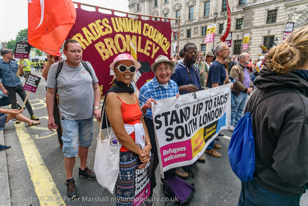 An angry crowd stopped in front of Downing Street where two thugs attacked me, attempting to grabbing me and attempting to pull my camera from my hand to prevent me taking pictures. I managed to pull away and move through the dense crowd, but they followed me through the mass of people for some distance repeatedly trying to take my cameras and camera bag until I got close to the police and march stewards in front of Downing St.