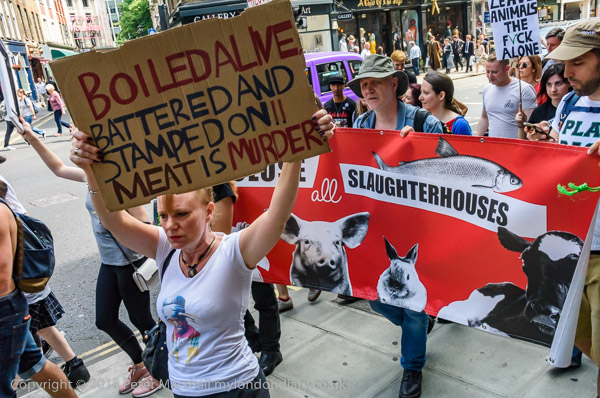 Vegans meet in Leicester Square and march through London calling for the closure of all slaughterhouses and a complete end to the killing of animals to provide food for human consumption.