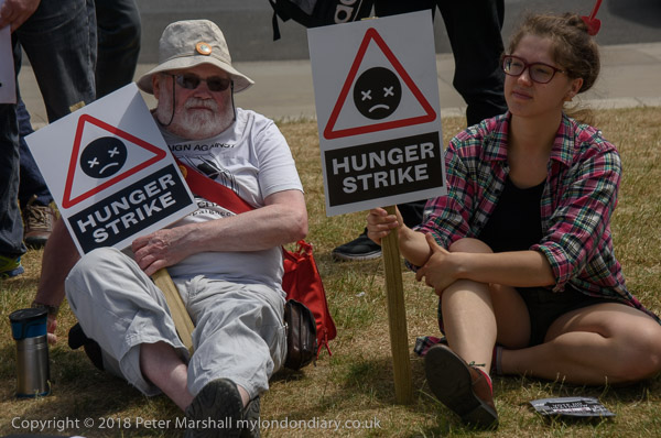A hunger striker holds two red umbrellas - one saying the SNP have