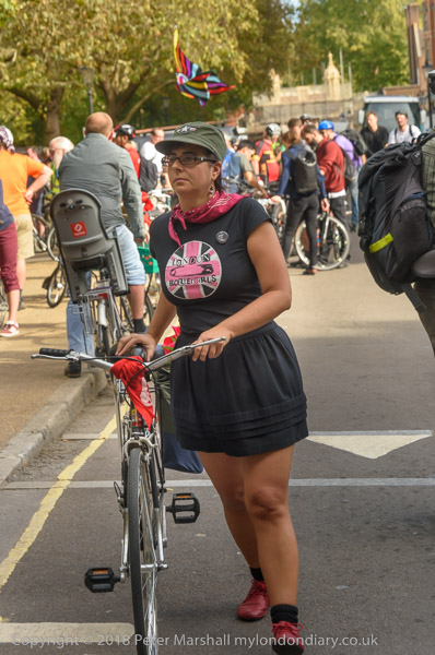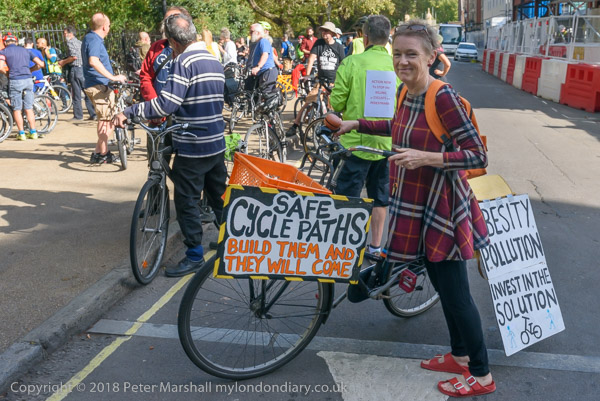 A woman has a poster on her bike for Safe Cycle Paths