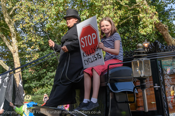 A young girls sits beside the driver on the hearse with a 'Stop Killing