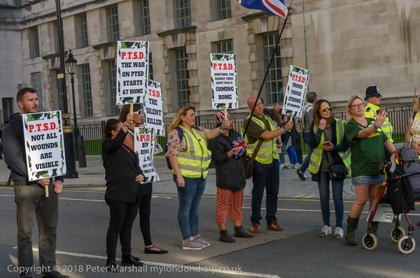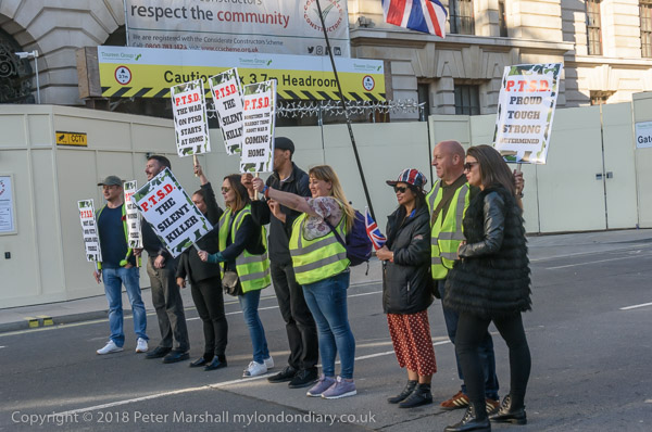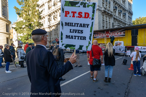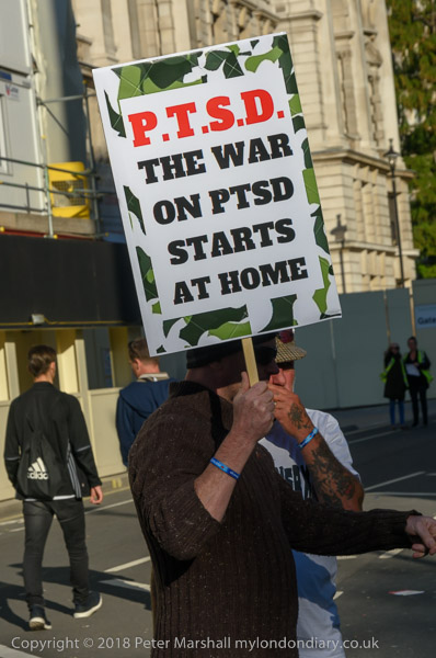 A man in a Maroon beret holds a placard 'P.T.S.D. Somethimes the hardest