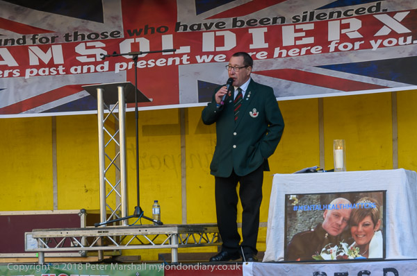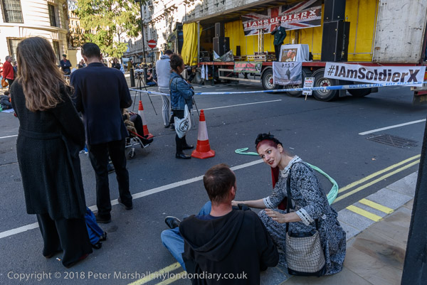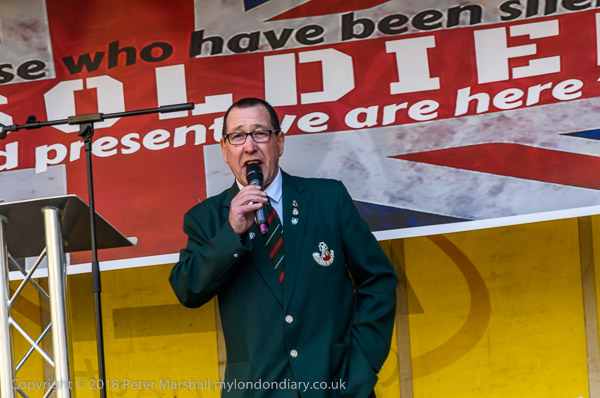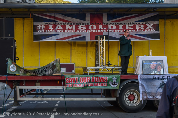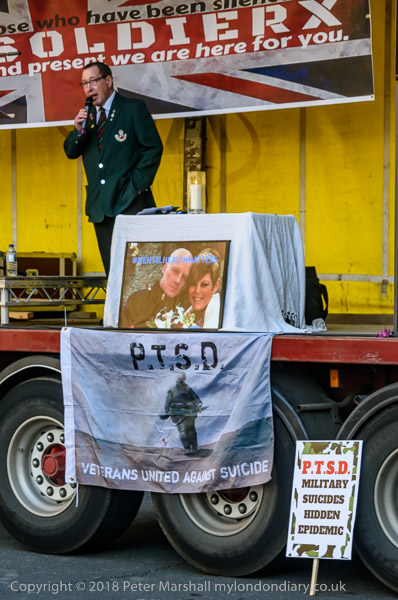 A speaker on the lorry underneath a Union Flag banner for SoldierX,