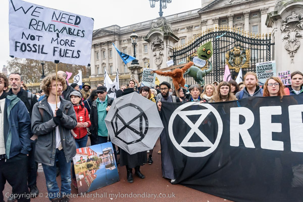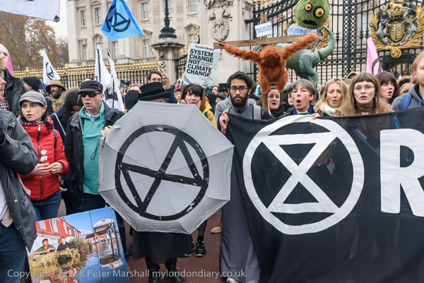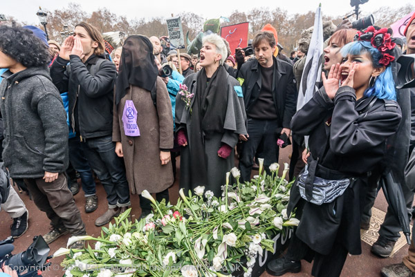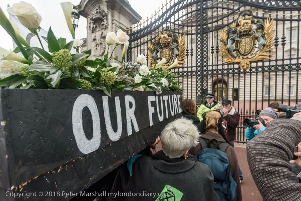 The pall-bearers approach Buckingham Palace with the Extinction Rebellion