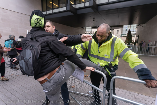 The protest took place on the steps leading up to 155 Bishopsgate. Security there objected to banners being taped to the wall, worried that the gaffer tape might cause some damage, but told the campaigners the protest could go ahead on the private steps if these were removed - which after some argument they were.