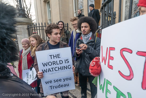 Campaigners at the Canadian Embassy protest in solidarity with the Wet'suwet'en of British Columbia, 14 of whom were arrested at gunpoint for stopping the construction of a pipeline to carry fracked gas across their homeland.