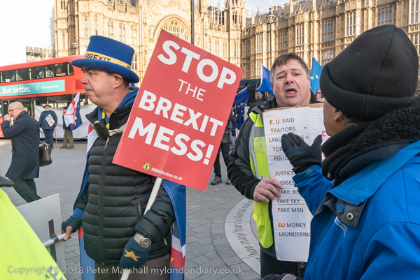 Groups against leaving the EU, including SODEM, Movement for Justice and In Limbo and Brexiteers Leave Means Leave and others protested opposite Parliament as Theresa May's Brexit deal was being debated.