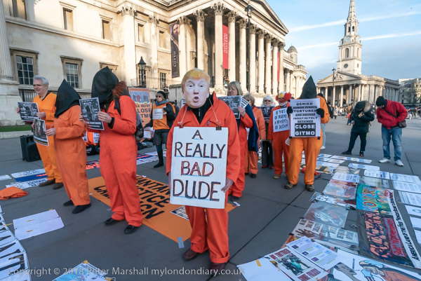 Members of the Guantanamo Justice Campaign, London Guantanamo Campaign & others mark the 17th anniversary of the first prisoners arriving at the illegal US camp with a display, tableau, vigil, readings and speeches in Trafalgar Square to highlight the abuse, torture, lack of human rights, force-feeding and indefinite detention still continuing there.