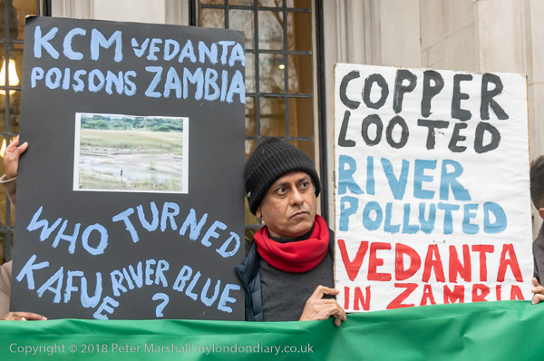 Several campaigners went inside to attend the hearing in the pubic gallery, while a couple stayed outside with the banner. At the lunchtime recess some posed briefly with banners and placards. Vedanta continue to claim that the case should not be heard in the UK as KCM is a Zambian company but both the High COurt and the Court of Appeal have ruled that Vedanta is responsible for the activities of its subsidiary and since Vedanta is a British company can be taken to court here.