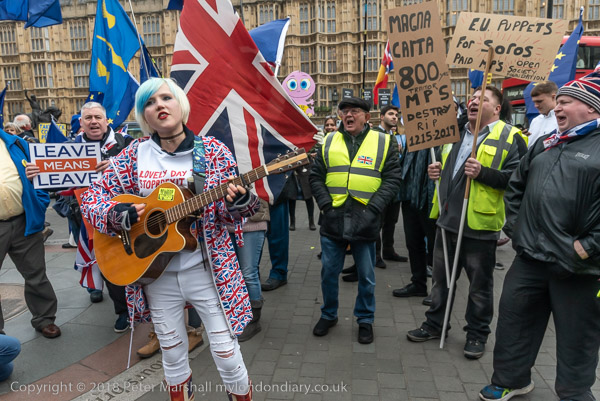On the day of another Brexit vote, protests around parliament continued , with remainers waving EU flags, and Brexiteers holding signs leave means leave.