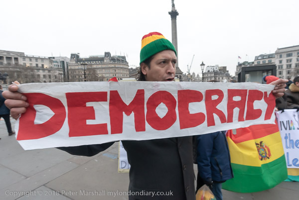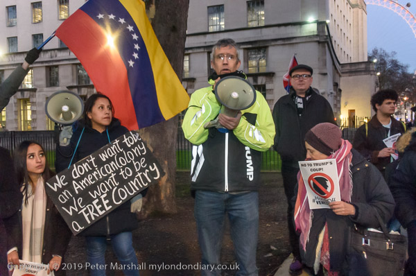 Protesters at Downing St condemn the US-backed attempt to replace Venezuelan President Nicolas Maduro, who was elected in a fair and free election last year by opposition leader Juan Guaidó, who the US and some other countries have recognised as the legitimate president and have demanded new elections.