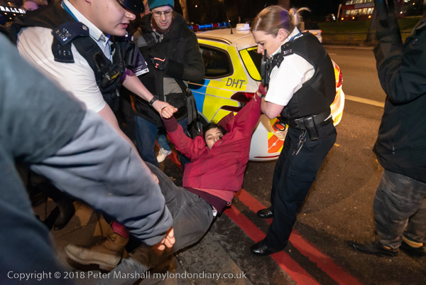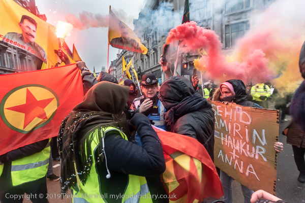 Most of the rally and the start of the march was in pouring rain, though it slackened off later. There was a large police presence, and a when some of the marchers displayed PKK flags, police made an attempt to rush in and snatch the people holding them, but were prevented by other protesters who protected them. Police brought in a larger snatch squad and for some minutes in Regent St there was an uneasy standstill as the protesters stopped marching and gathered to protect a further attempt at arrest by police.